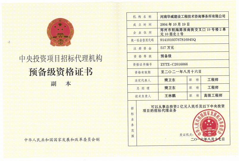 為增強我公司的競爭實力,擴大業務范圍,依據《中央投資項目招標代理資格管理辦法》,我公司認真準備相關材料并積極申請,于20168月取得“中央投資項目招標代理預備級”資質,可以從事總投資2億元人民幣及以下中央投資項目的招標代理業務。我公司將按照有關法律法規的要求,嚴格按照招標程序和工作規范執業,為客戶提供更加優質的服務!