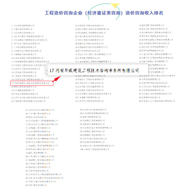 河南華威公司位列2020工程造價咨詢企業(yè)造價咨詢收入第17名!連續(xù)兩年入圍全國百強排名前20名。
